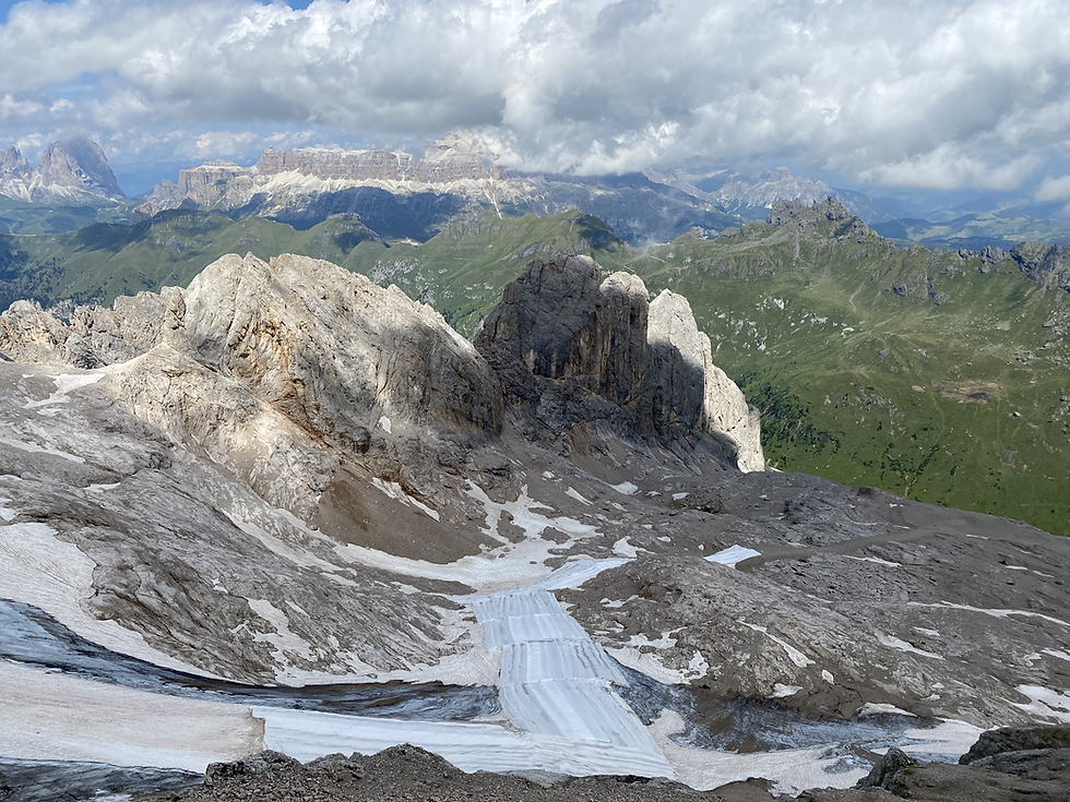 Nous nous rendons à la plate forme et profitons pleinement de la fraîcheur ambiante. Sur les flancs de la Marmolada, se trouve une couche de neiges éternelles, et la partie supérieure est recouverte d'un ciré.