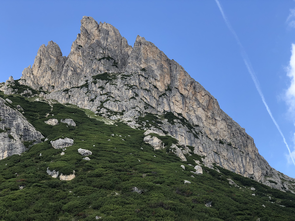 En début d'après midi nous traversons Cortina d'Ampezzo, sans nous arrêter et direction le massif Tofana, car nous dormons ce soir au refuge Pomedes, à 2300m d'altitude.